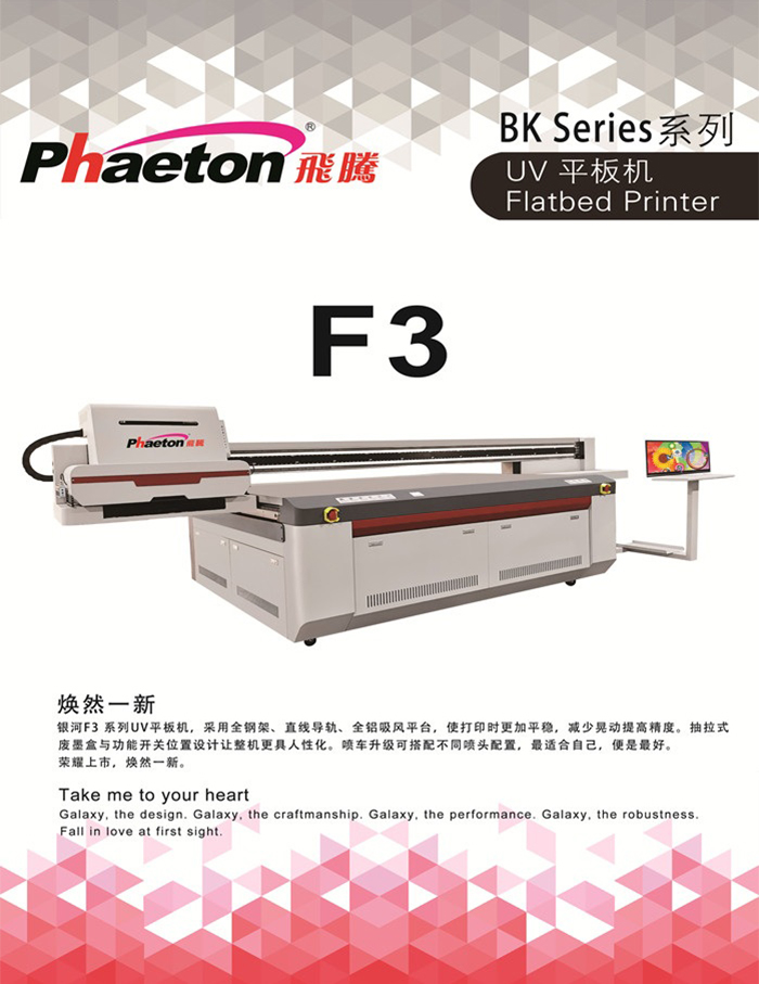 銀河F3系列UV平板機,采用全鋼架、直線導軌、全鋁吸風平臺,使打印時更加平穩(wěn),減少晃動提高精度。抽拉式廢墨盒與功能開關位置設計讓整機更具人性化。噴車升級可搭配不同噴頭配置,最適合自己,便是最好。 榮耀上市,煥然一新。